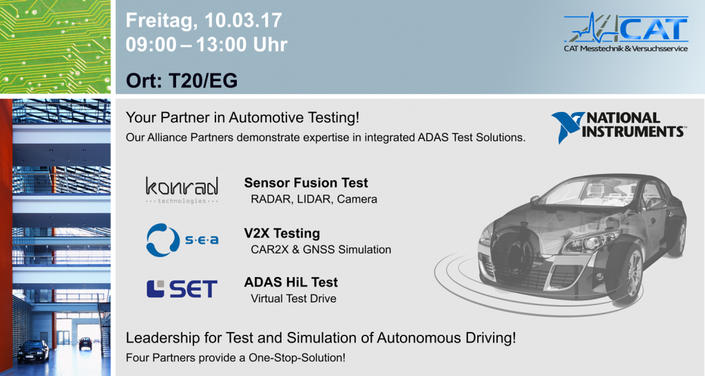 Beim nächsten CAT TechDay am Freitag, den 10. März 2017, sind die Experten für ADAS-Testsysteme von National Instruments, Konrad Technologies GmbH, S.E.A. GmbH und SET GmbH zu Gast.