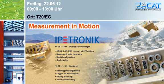 Der nächste CAT TechDay zeigt Ihnen von der Modulkonfiguration bis zur Video-Aufzeichnung, wie mobiles Messen und Prüfen in der Fahrzeugentwicklung mit IPETRONIK funktioniert.