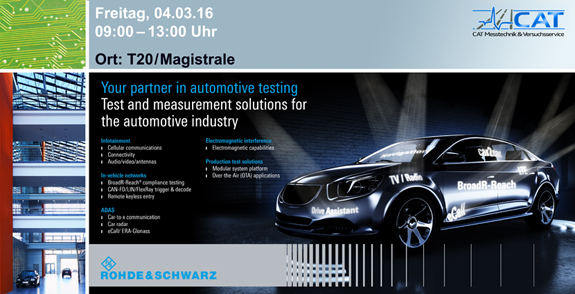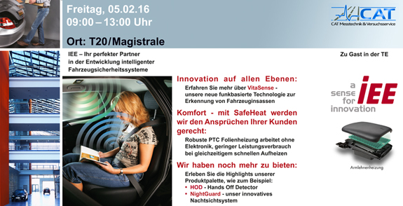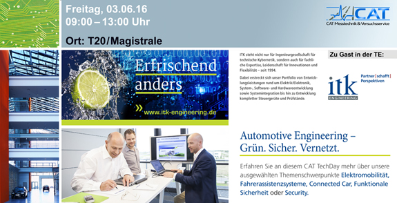 Am Freitag, den 3. Juni 2016, können Sie auf dem CAT TechDay die Systeme und Lösungen von ITK Engineering für Elektromobilität, Fahrerassistenzsysteme, Connected Car, funktionale Sicherheit und Security kennenlernen.