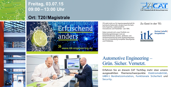 Auf dem CAT TechDay am Freitag, den 3. Juli, werden die Experten von ITK Engineering ihre Systeme und Lösungen in den Bereichen Elektromobilität, Bordnetzsimulation, funktionale Sicherhheit und Security präsentieren.