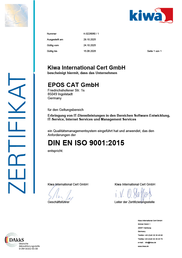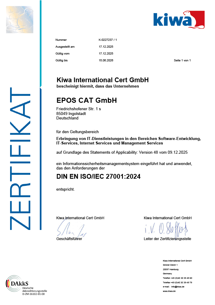 Die Zertifizierung durch ein unabhängiges Prüfinstitut belegt, dass EPOS die Vertraulichkeit, Integrität und Verfügbarkeit sowohl der eigenen Datenbestände als auch der Informationen seiner Kunden verlässlich schützt.